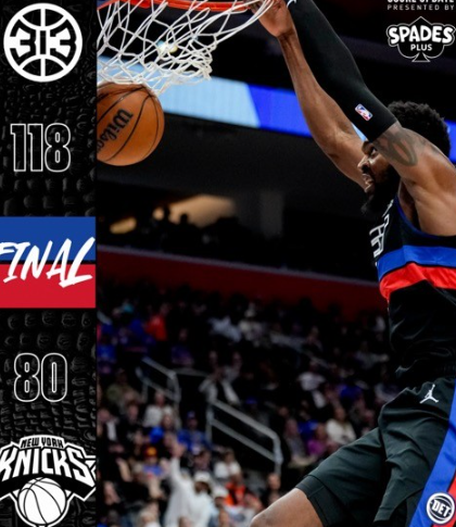 吉祥体育 – 底特律活塞队在主场以118-80击败纽约尼克斯队,赢得了一场NBA常规赛的胜利。杜兰特缺席,坎宁安得到11分、5个篮板和7次助攻